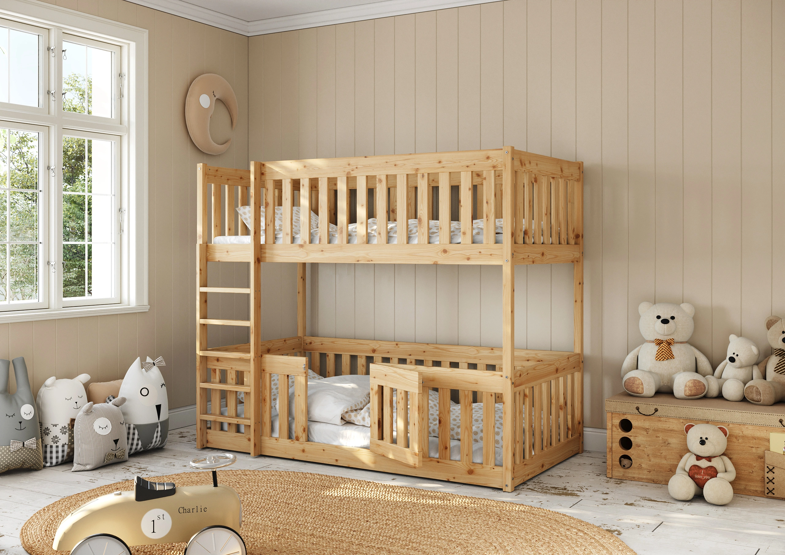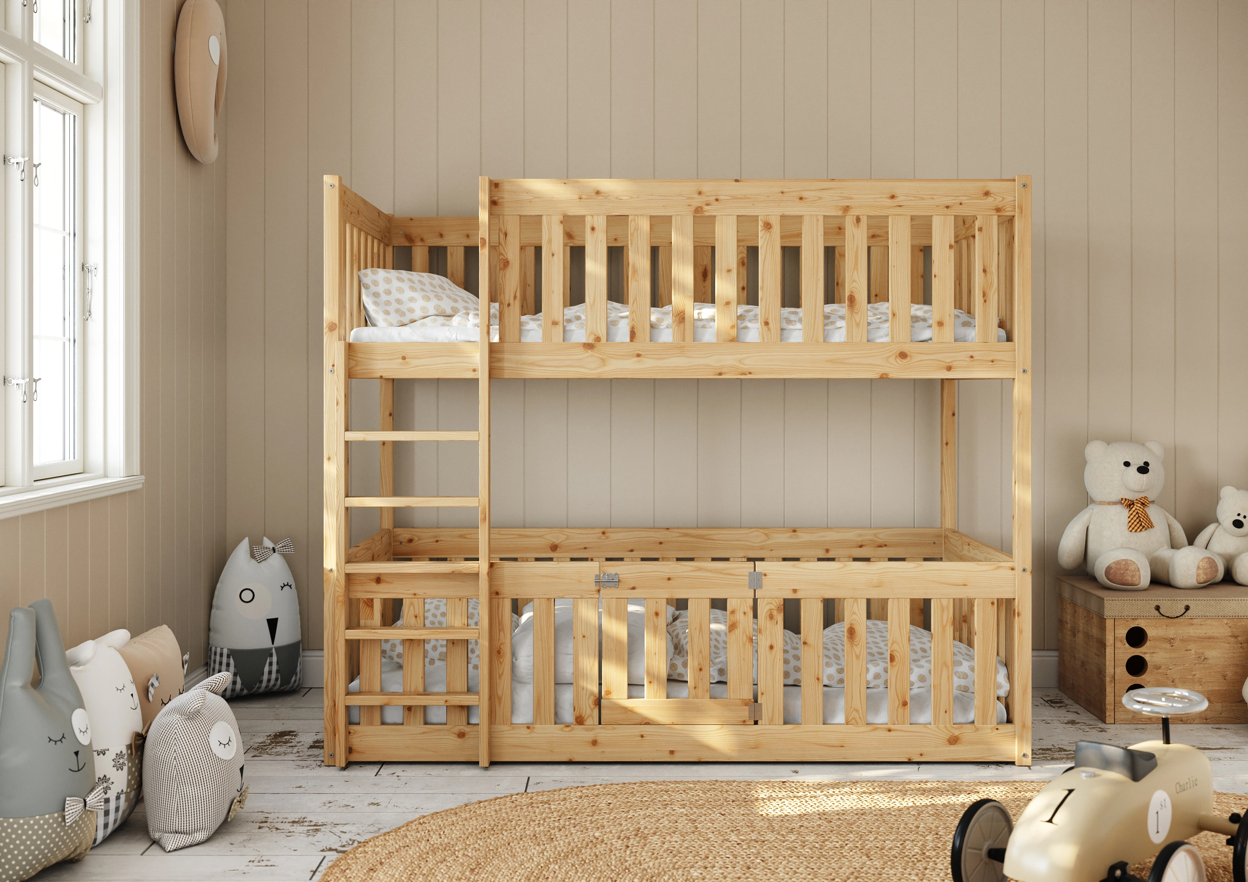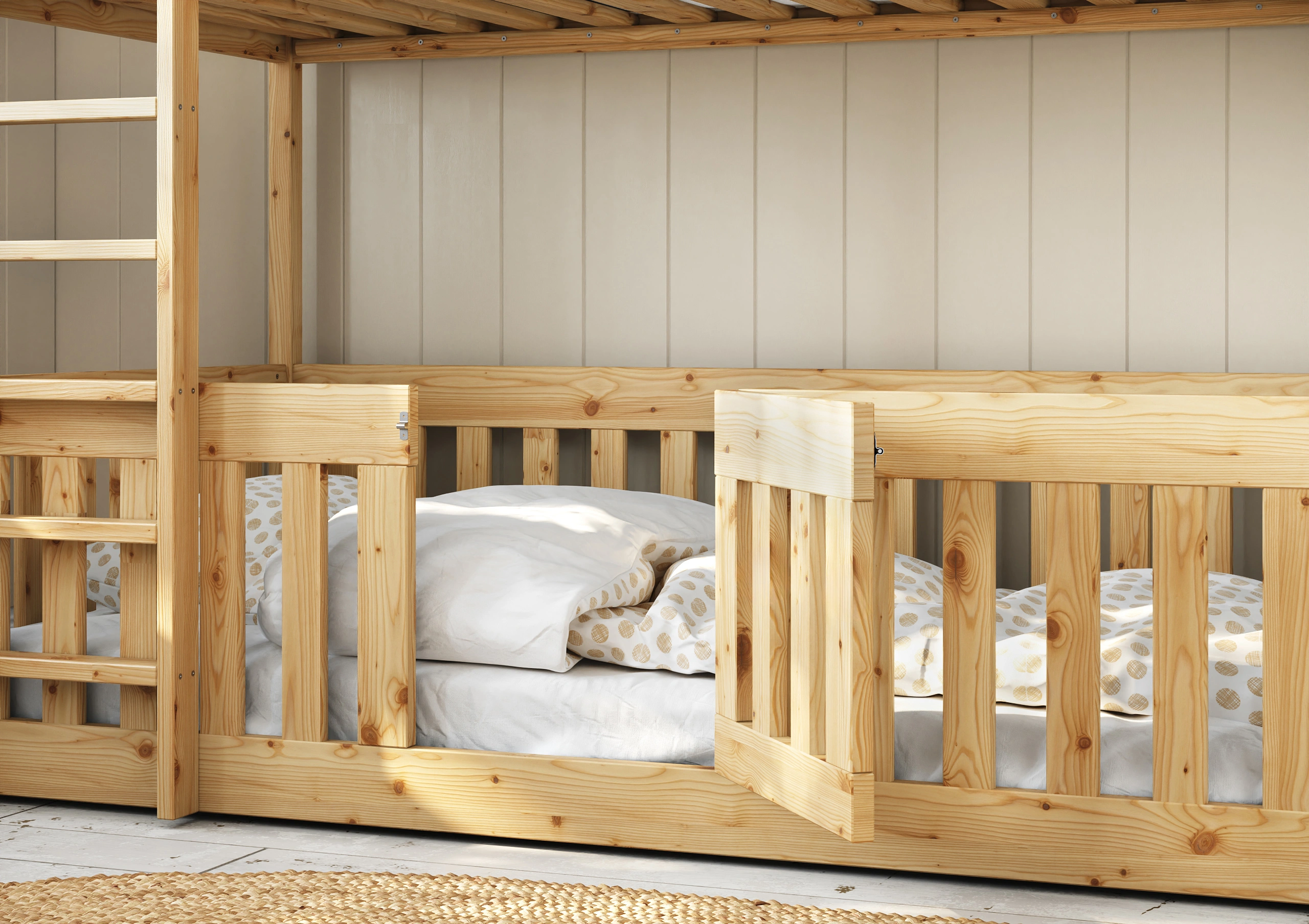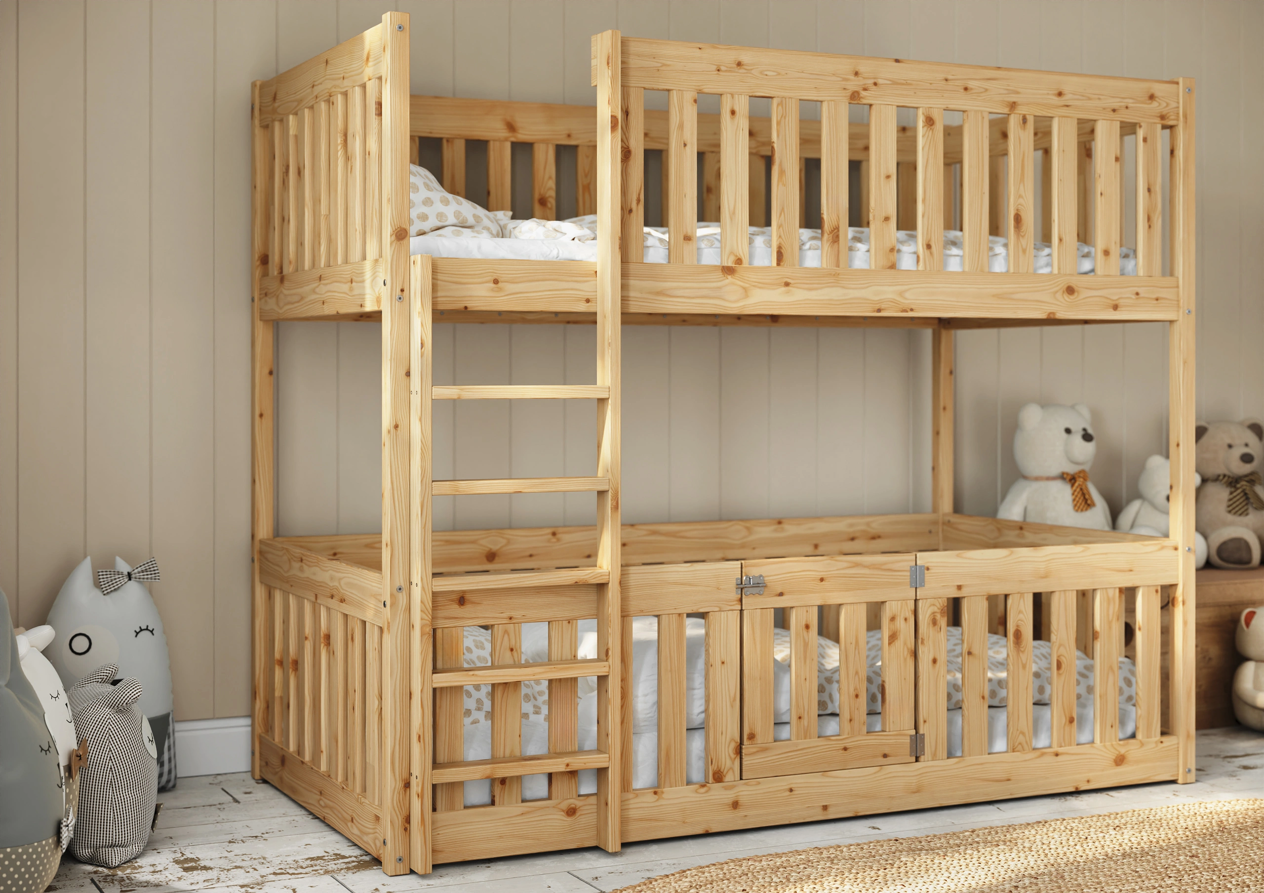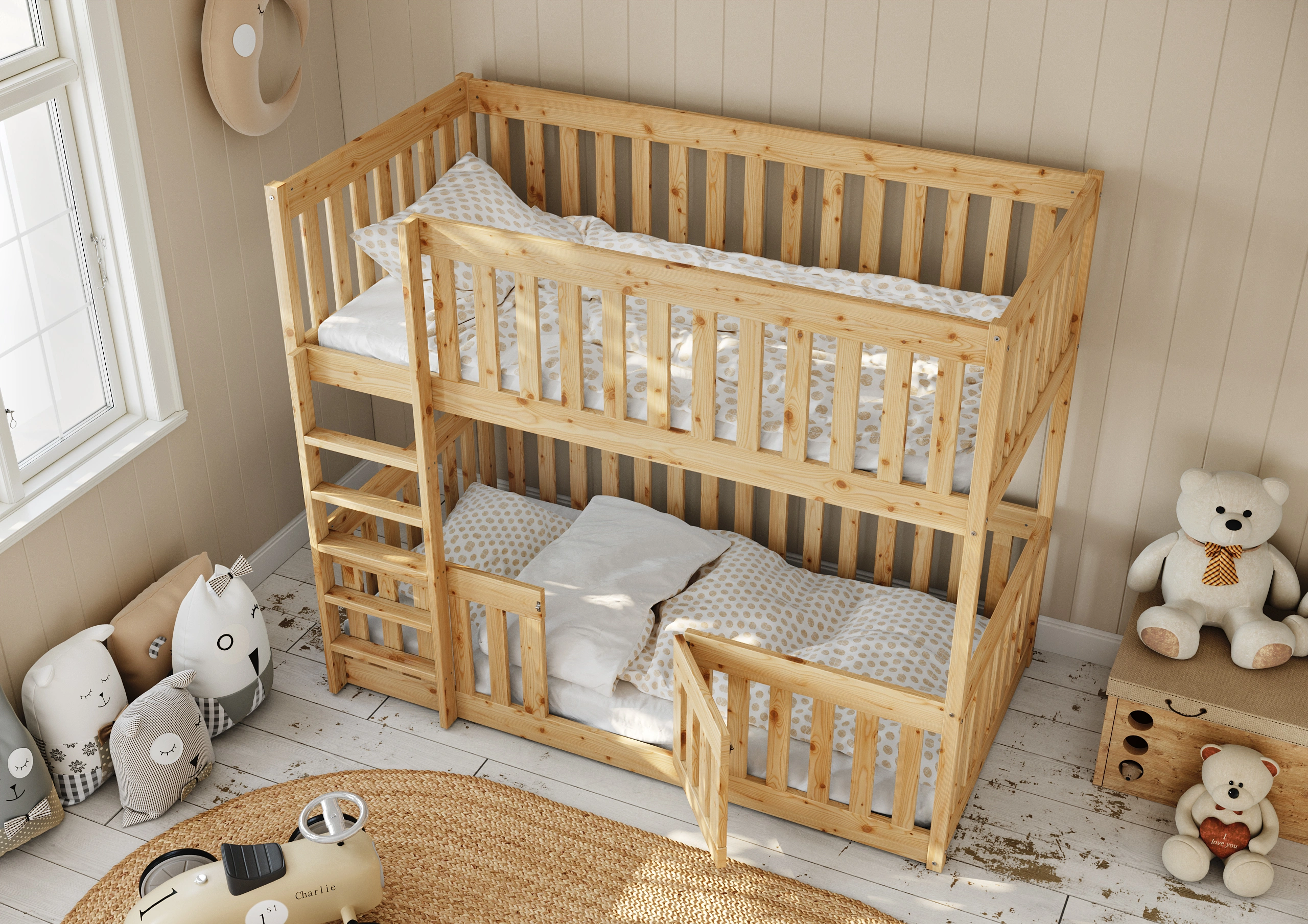 S ohľadom na našich malých nezbedníkov a milovníkov zábavy sme vytvorili niečo výnimočné - poschodovú posteľ Mikeš, ktorá sa vyznačuje pevnou a dobre navrhnutou spodnou konštrukciou postele, určenou pre deti od 1 roka. Predovšetkým sme si dali záležať na tom, aby ochranné zábrany boli mimoriadne vysoké a zabránili tak pádu dieťaťa z postele.