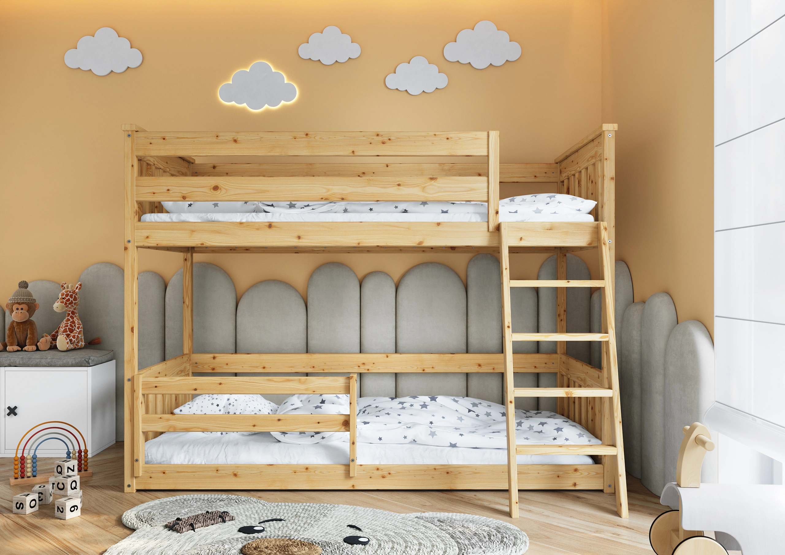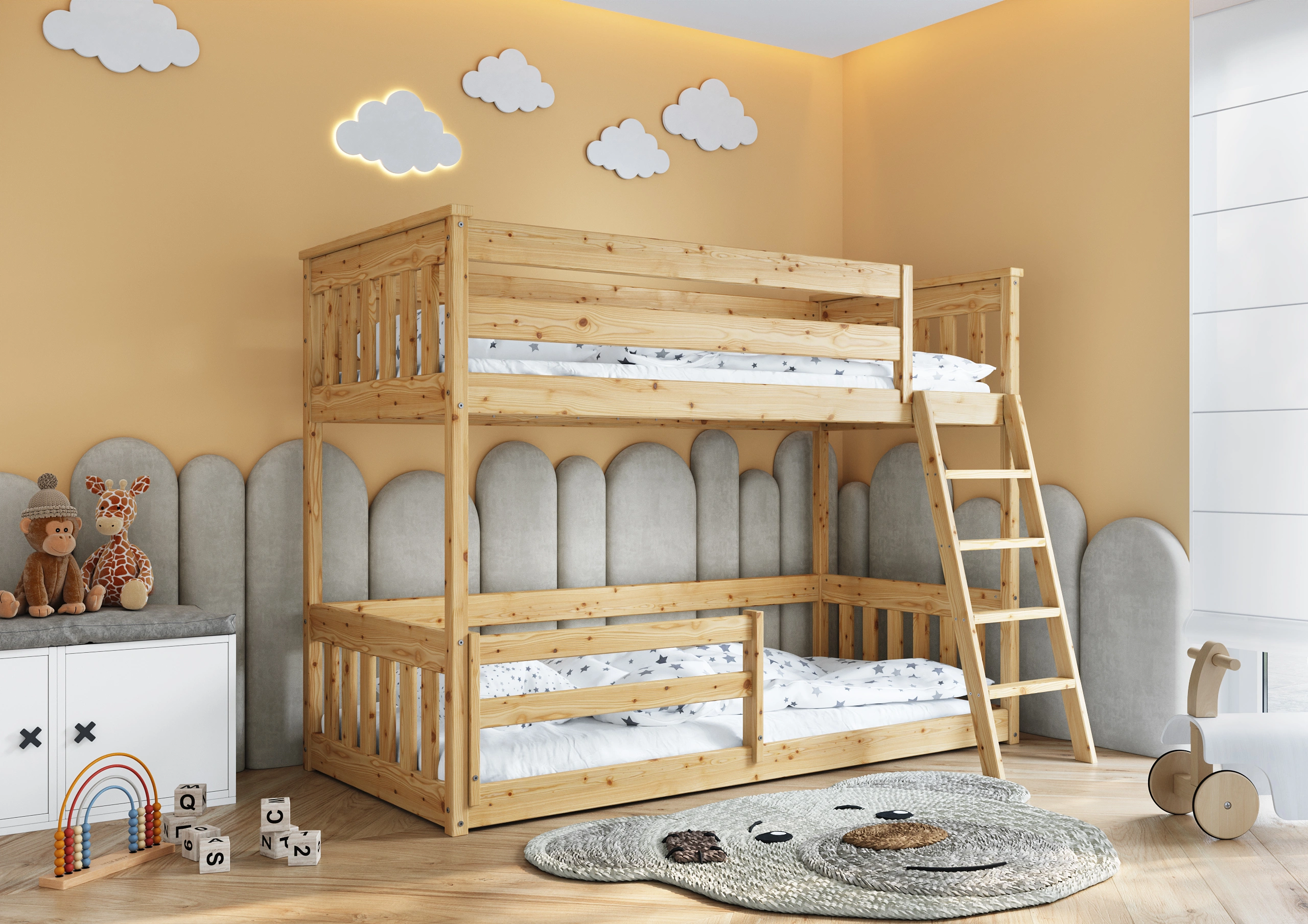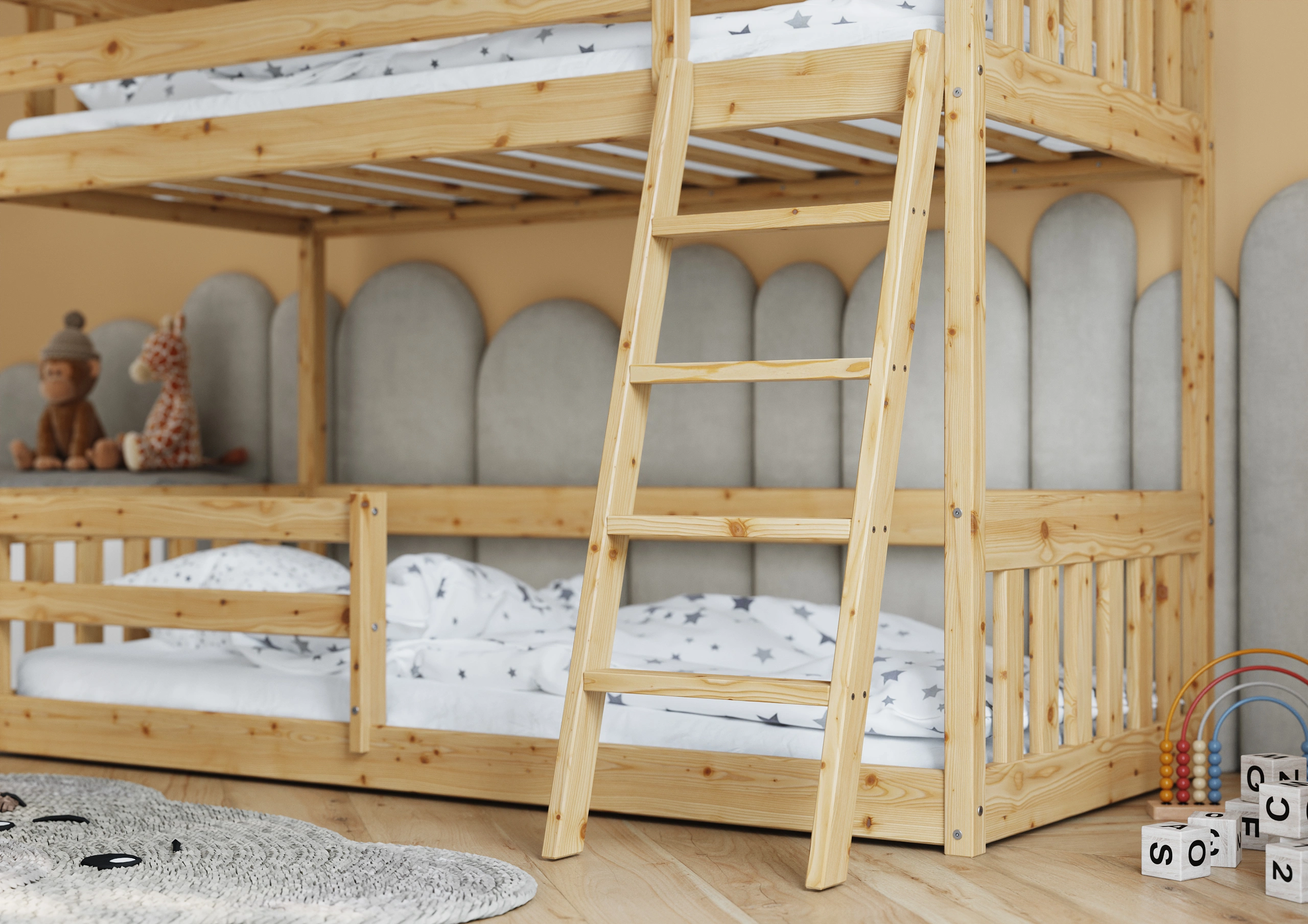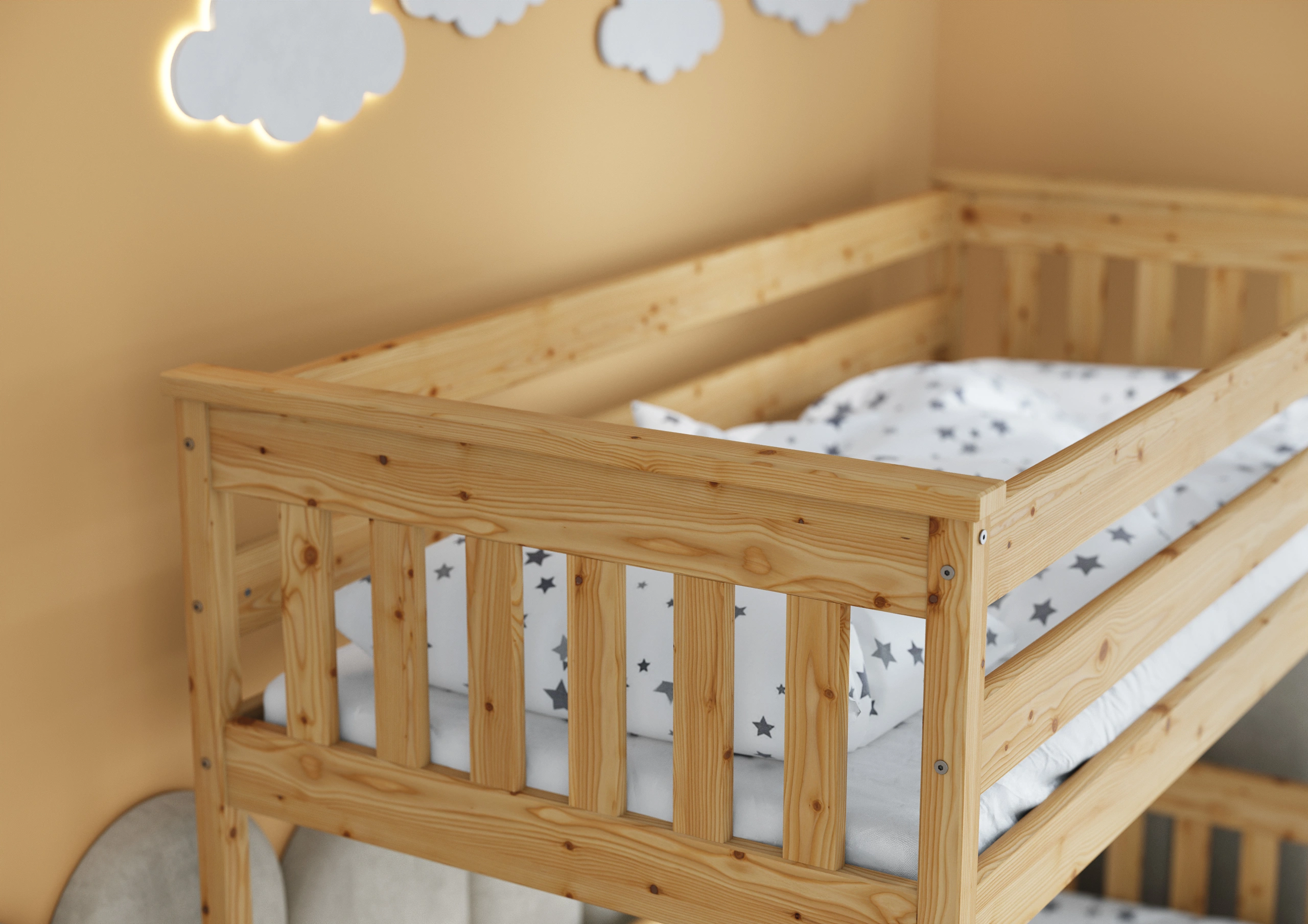 Všetky hrany sú zaoblené a posteľ je navrhnutá s na maximální bezpečnost vašeho dítěte. Všechny prvky jsou pečlivě dokončeny, a dřevo je hladké a příjemné na dotek.