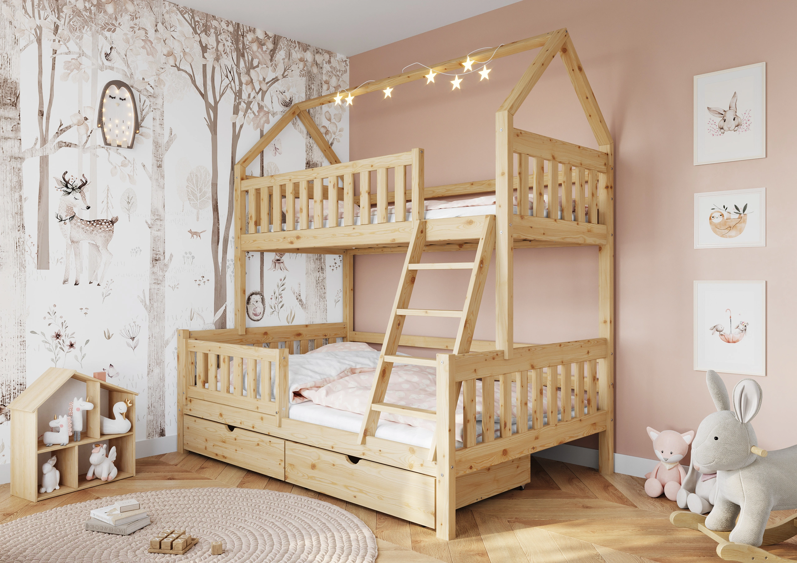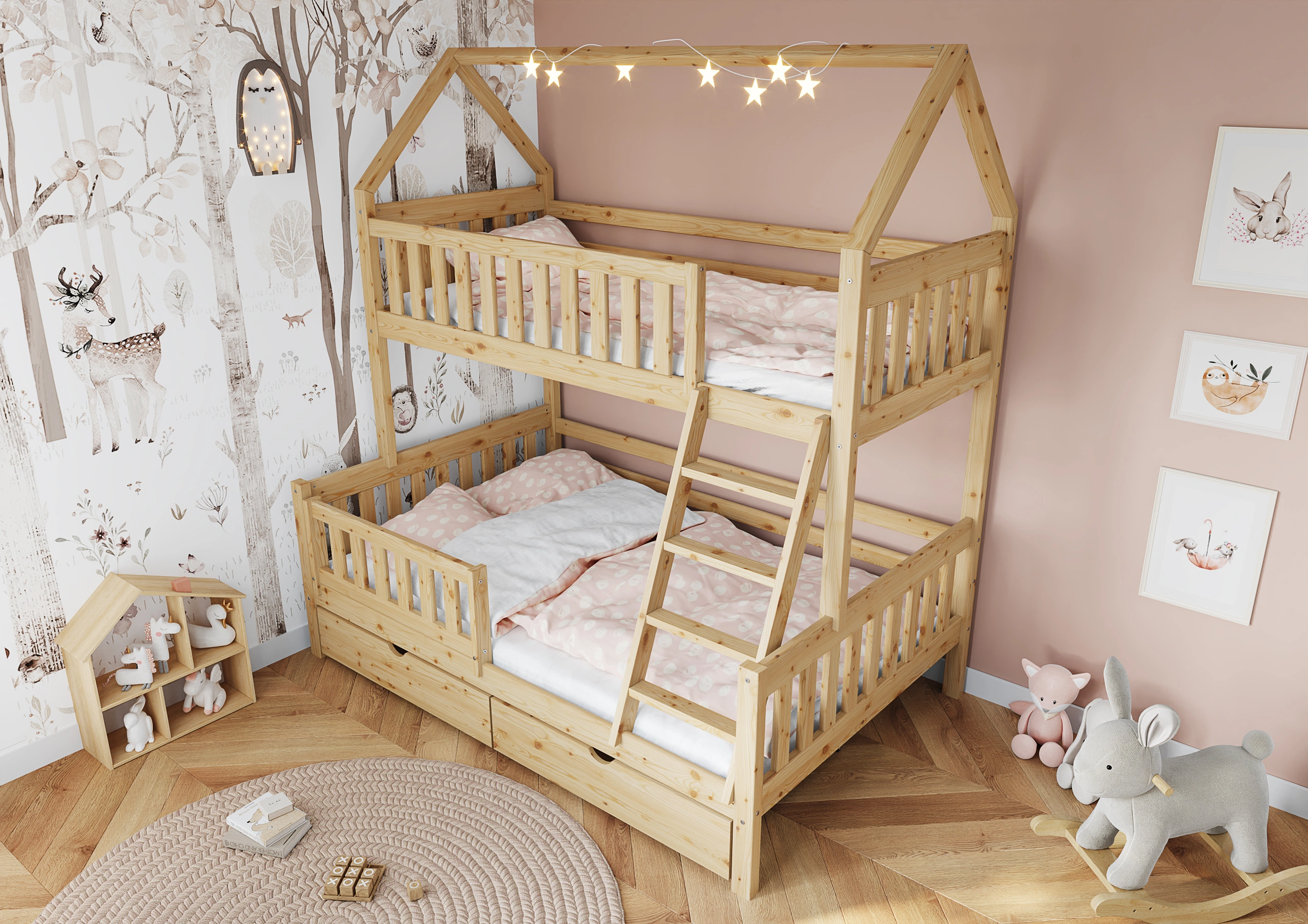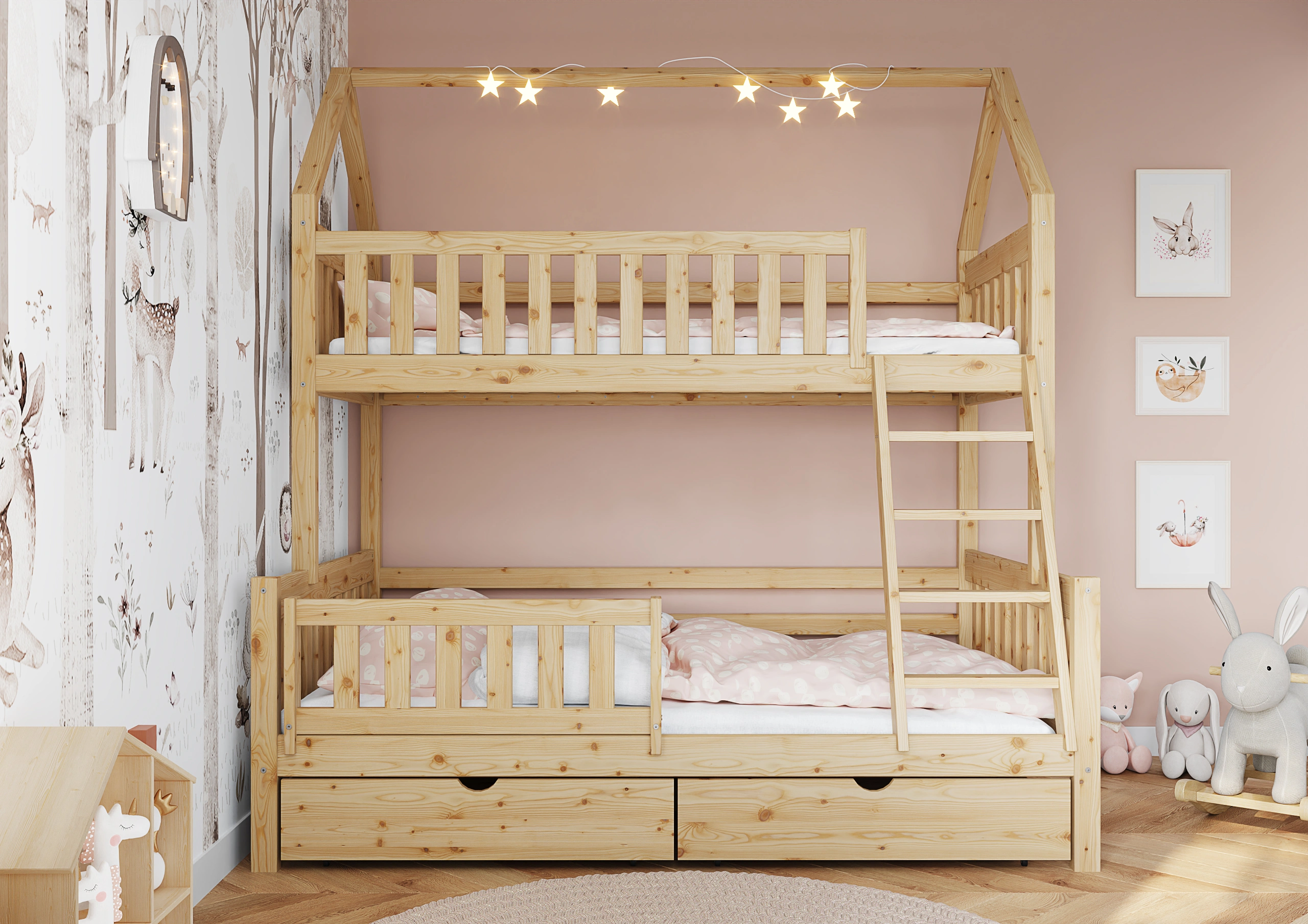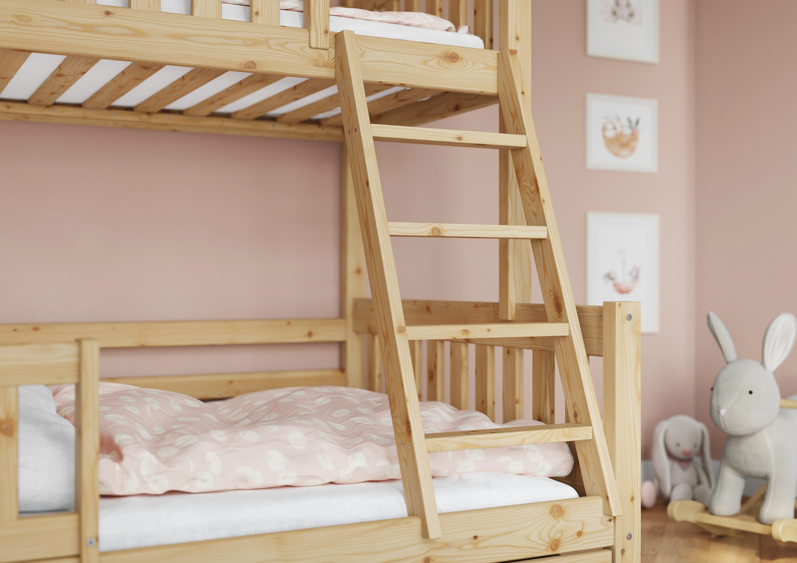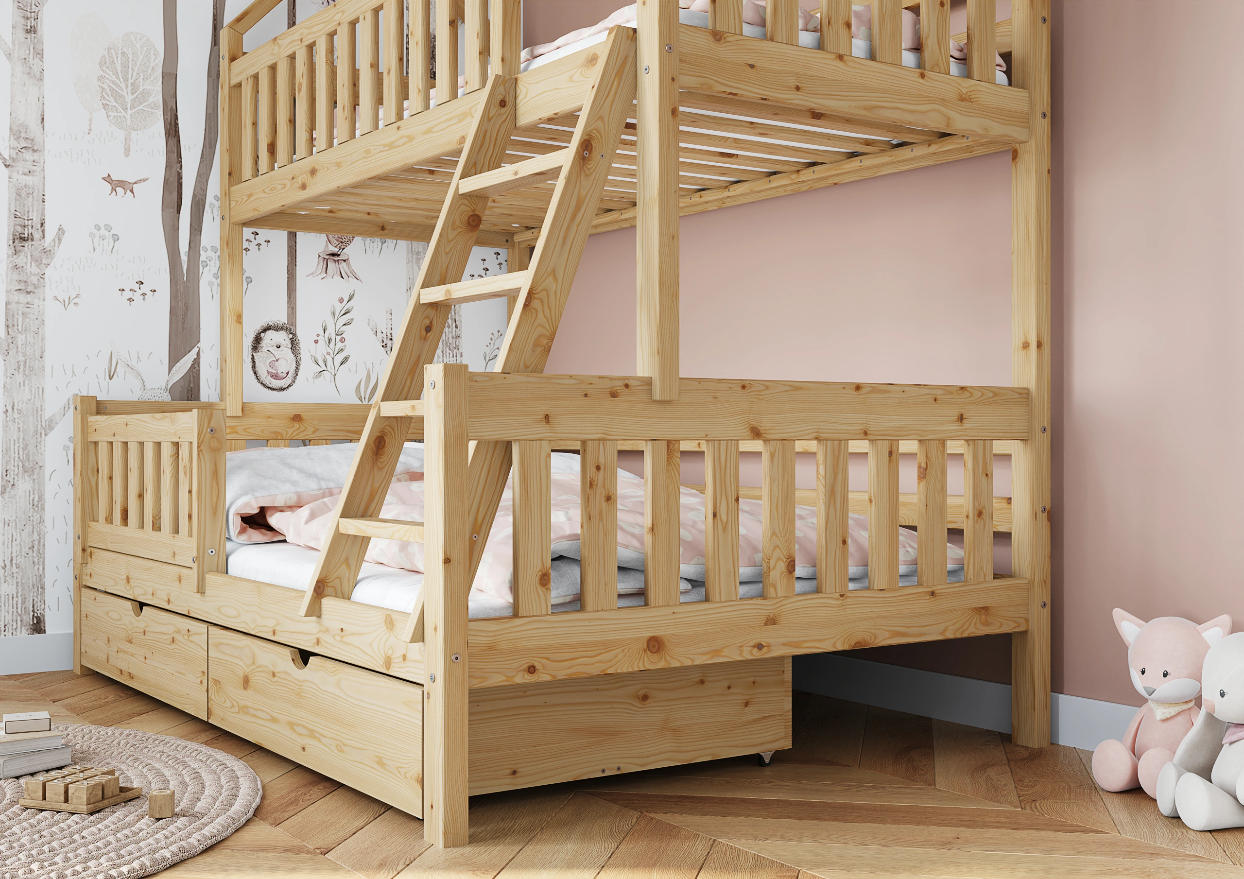 Hľadáte ideálnu poschodovú posteľ pre tri deti, ktorá spája bezpečnosť, trvanlivosť a funkčnosť? Poschodová posteľ Stanislav je odpoveďou na Vaše potreby. Navrhnutá s ohľadom na bezpečnosť najmenších používateľov, má vysoké ochranné zábrany a stabilnú konštrukciu, čo minimalizuje riziko pádu počas spánku a hry. Solídne vyhotovenie z vysokokvalitného borovicového dreva zaručuje trvanlivosť a stabilitu postele na mnoho rokov. Bezpečné, zaoblené hrany a atestované materiály sú zárukou pokojného spánku Vašich detí. Posteľ Stanislav nie je len bezpečným miestom na spanie, ale aj priestorom pre kreatívnu zábavu. Možnosť vlastnej aranžácie priestoru umožňuje vytvoriť unikátne miesto, ktoré podnecuje predstavivosť a povzbudzuje k aktívnemu tráveniu času.