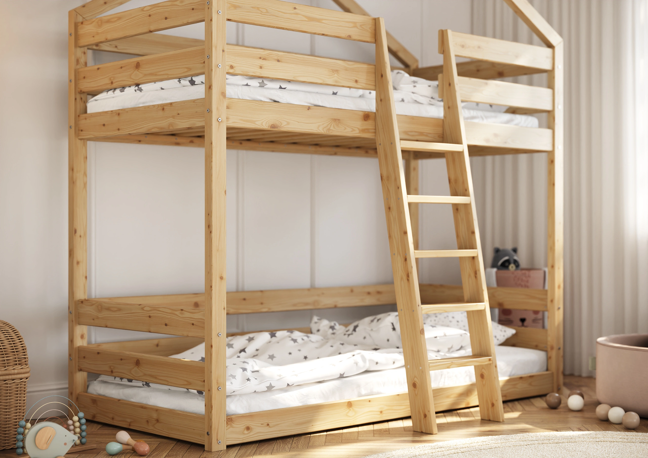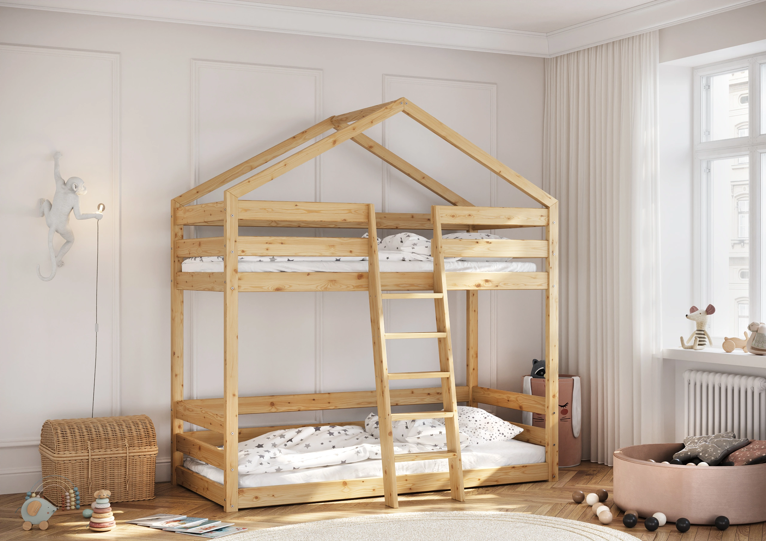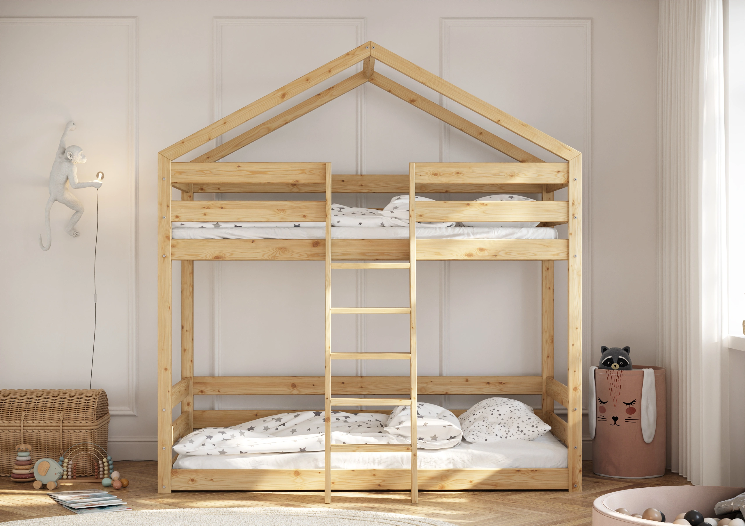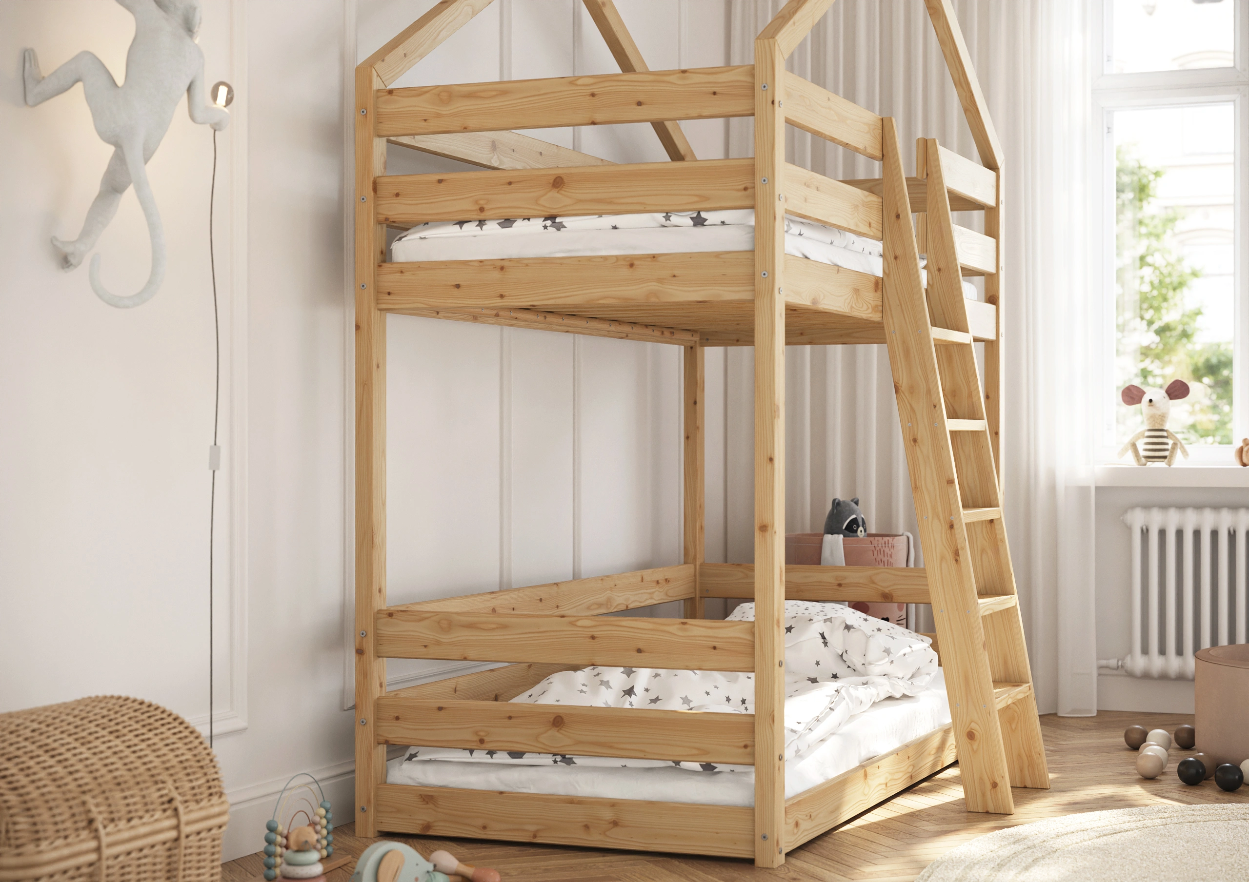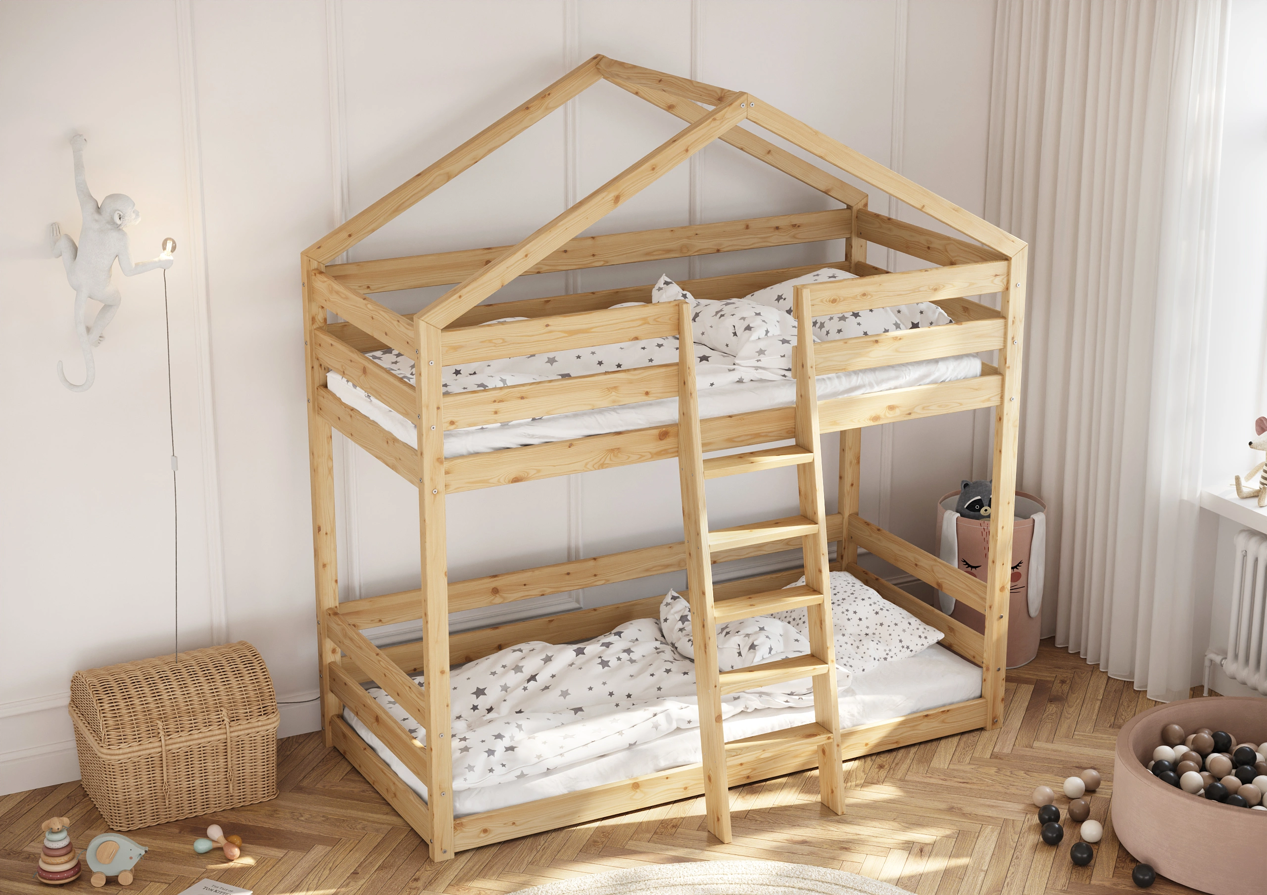 Darujte svojmu dieťaťu nielen pohodlné miesto na spanie, ale skutočnú rozprávkovú krajinu s našou Poschodovou Posteľou Domček Slavko! Táto výnimočná posteľ spája v sebe bezpečnosť solídnej drevenej konštrukcie s čarom dizajnu inšpirovaného útulným domčekom. Ideálne riešenie do izby súrodencov alebo ako magická základňa na hry pre jedno dieťa, ktoré získa dodatočný priestor dole. Vyrobená z trvanlivého, prírodného borovicového dreva, poschodová posteľ Slavko zaisťuje stabilitu a bezpečnosť na roky. Vysoké ochranné zábrany na hornom lôžku zaručujú pokojný spánok Vášho dieťaťa a pohodlný a stabilný rebrík umožňuje bezpečné vchádzanie a schádzanie.