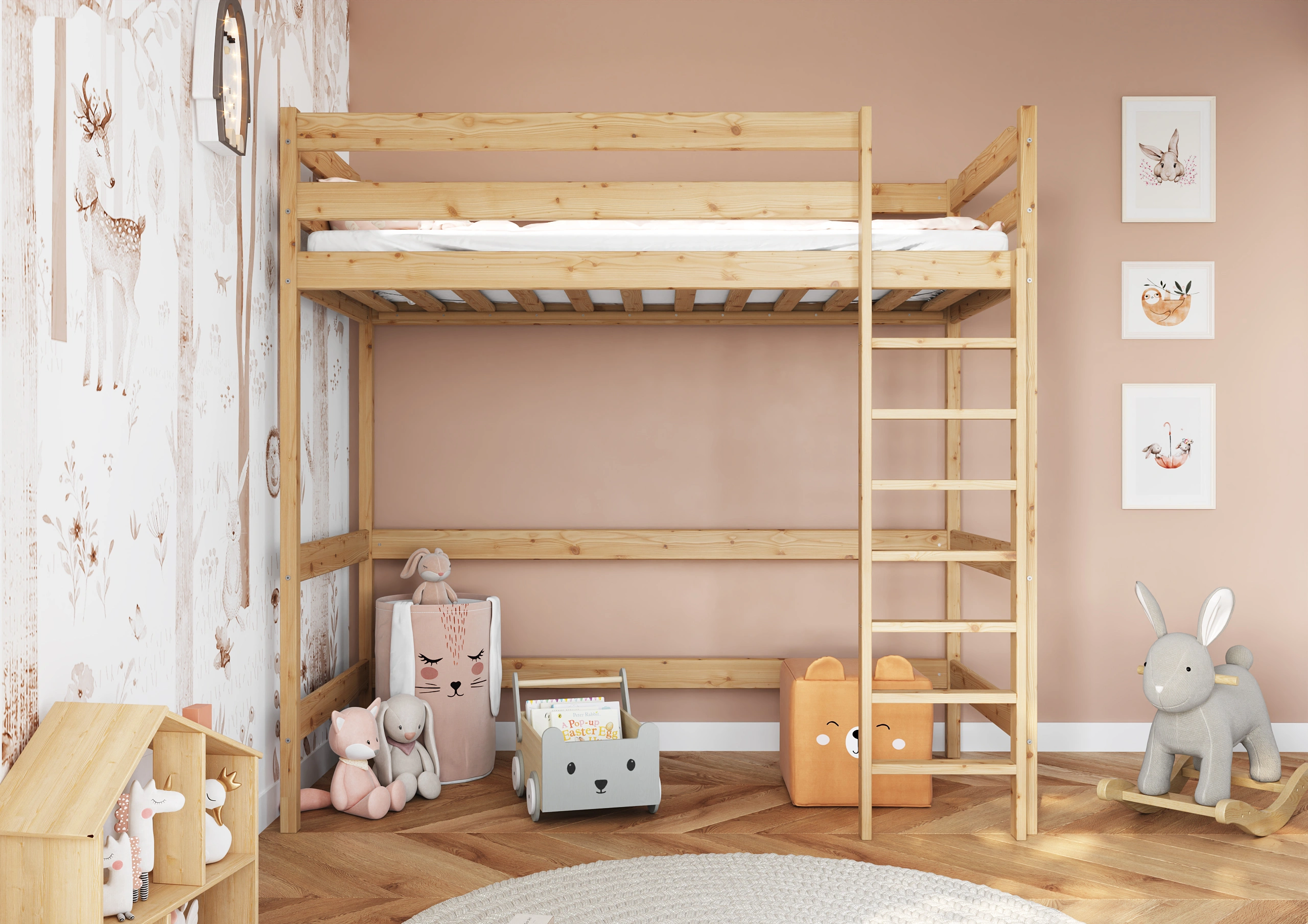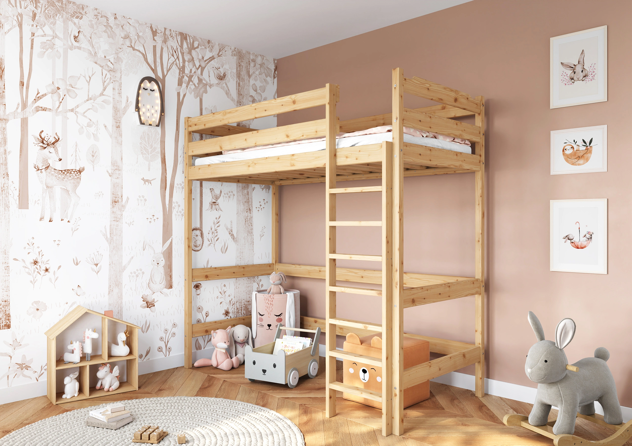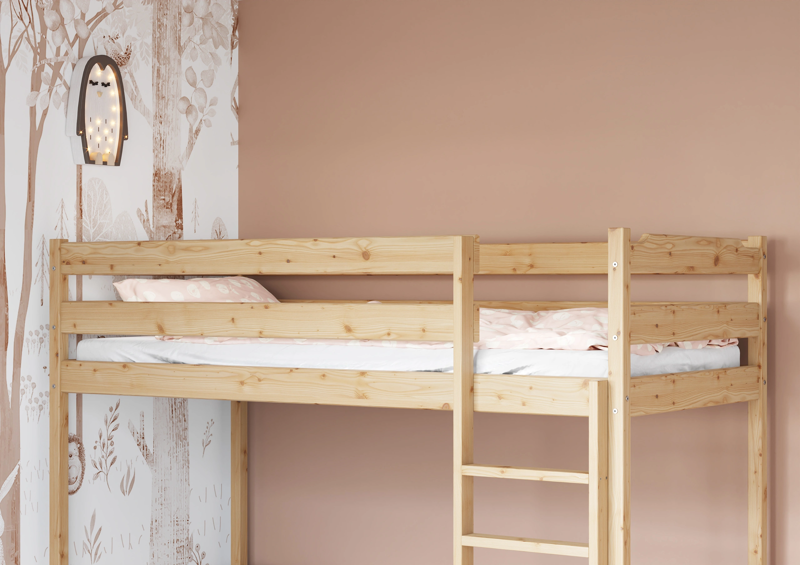 Rebrík na posteľ z masívneho borovicového dreva so širokou schodíkmi a zábradlím, ktorý poskytuje bezpečný prístup do hornej časti. NápadyIdeálny pre 3-ročné deti, zabezpečuje stabilitu postele. Estetický prvok, ktorý zároveň usnadňuje život a zdobí pokoj.