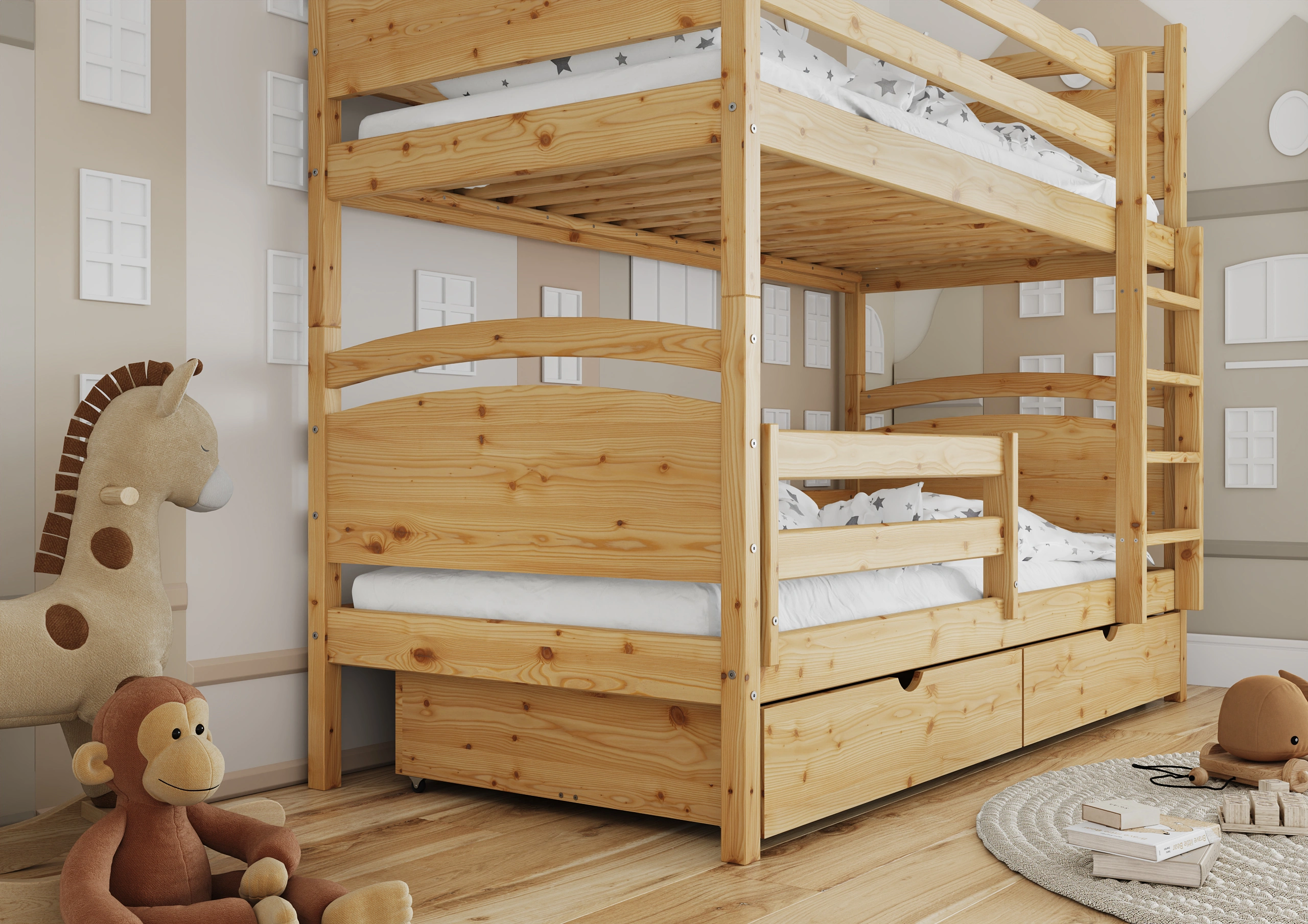 Používame výlučne masívne borovicové drevo, ktoré je odolné., stabilné. Vďaka tomu majú naše postele dlhú životnosť a sú bezpečné.