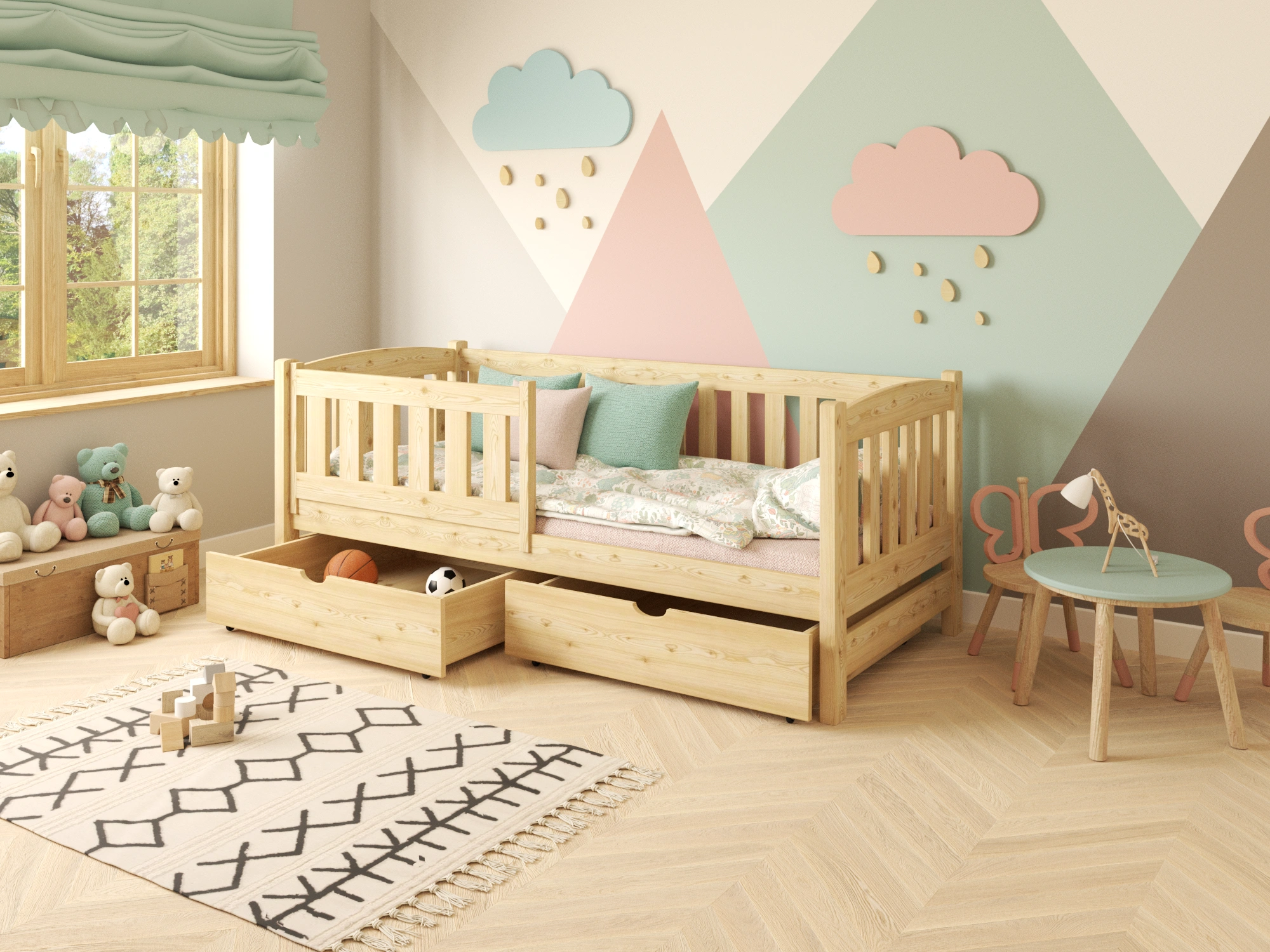Medzi jednoposchodovými poschodovými posteľami, ktoré odporúčame našim malým zákazníkom, je Kája nesporným bestsellerom. Tento model zaujme svojím moderným, minimalistickým tvarom, ktorý ide ruka v ruke s bohatou funkčnosťou. Skvele vyzerá v detských izbách zariadených v akomkoľvek štýle, a to vďaka možnosti individuálneho výberu farby nábytku. Je to posteľ snov pre každú malú princeznú a odvážneho malého hrdinu. Detská posteľ Kája je vyrobená výlučne z masívneho borovicového dreva, ktoré pochádza z poľských lesov. Záleží nám na bezpečnosti vašich najmenších, preto venujeme osobitnú pozornosť detailom - precíznemu zaobleniu hrán, ako aj brúseniu povrchu postele a maľovaniu hypoalergénnymi farbami.