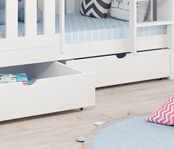 Zásuvky pod posteľou (s hĺbkou 80 cm) na kolieskach sú praktické. m řešením na povlečení. Odporné proti zašpinění díky pevné laminované desce s bílým obložením. Umožňují chytré uspořádání dětského pokoje s dodatečným místem na povlečení, hračky nebo oblečení.